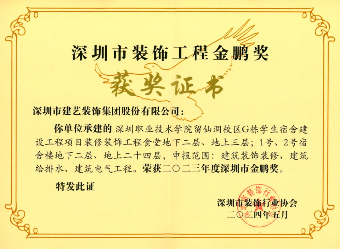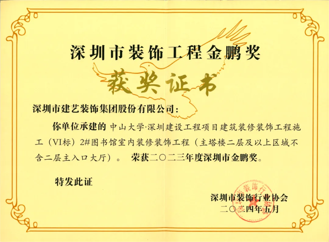 近日,由深圳市装饰行业协会组织评选的2023年度深圳市装饰工程“金鹏奖”获奖名单揭晓,由j9九游会集团承建的中山大学∙深圳建设工程项目建筑装修装饰工程施工(VI标)、深圳市中医院光明院区一期项目建筑装修装饰工程施工II标项目、深圳职业技术学院留仙洞校区G栋学生宿舍建设工程项目装修装饰工程,共计3项工程荣获嘉奖,企业的技术优势和施工水准再获行业肯定。