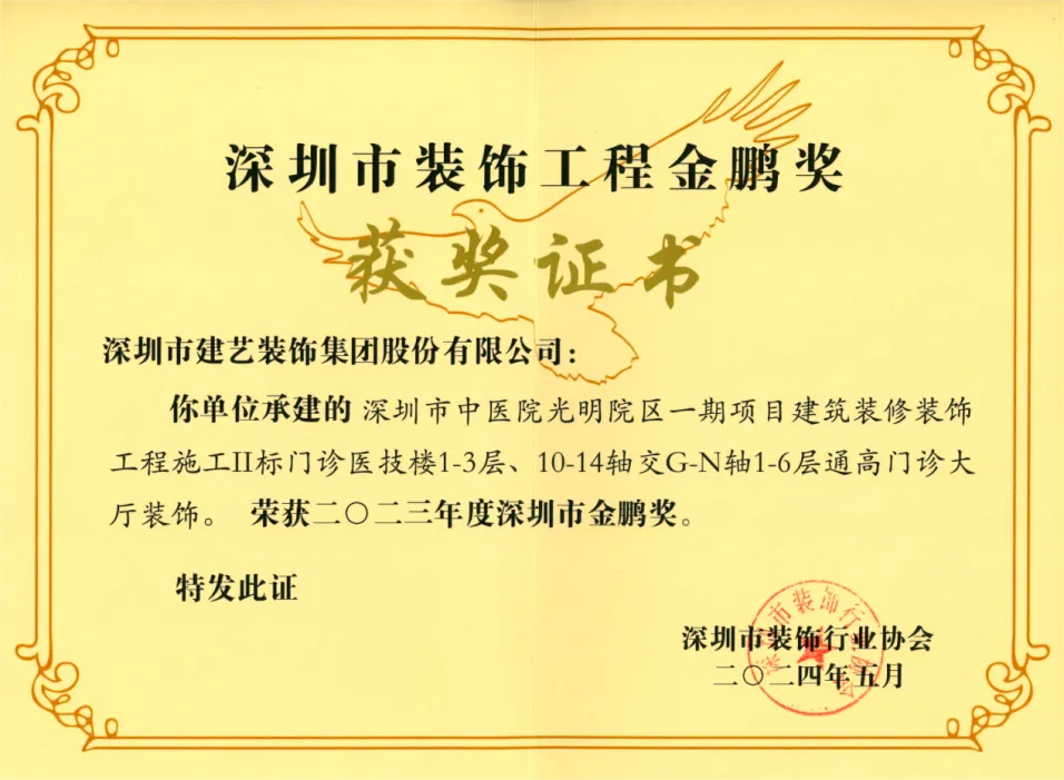 深圳市装饰工程“金鹏奖”是目前深圳市级建筑装饰行业最高级别质量奖项。该奖项旨在鼓励企业增强质量管理意识,提高工程建设质量和项目管理水平,展现深圳装饰企业的风采及工程质量水平,树立深圳装饰行业内的优秀企业和精品工程典范。